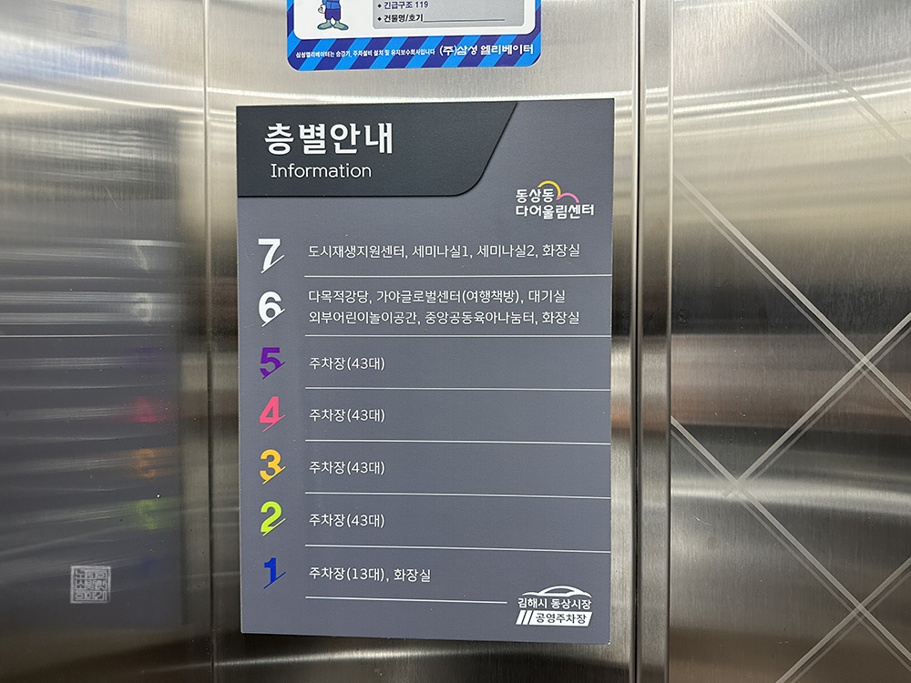 동상시장 공영주차장의 엘리베이터를 탄다면 각 층마다 최대 주차할 수 있는 차량의 대수를 확인할 수 있다. 1층에는 13대, 2층부터 5층까지는 43대씩 주차가 가능하기 때문에 기사로 읽어볼 수 있었던 최대 185대 주차가 가능한 것이 맞았다. 단, 출입구가 따로 놓여 있는 게 아니라 같은 길로 오르락내리락해야 해서 주의가 필요해 보였다.
