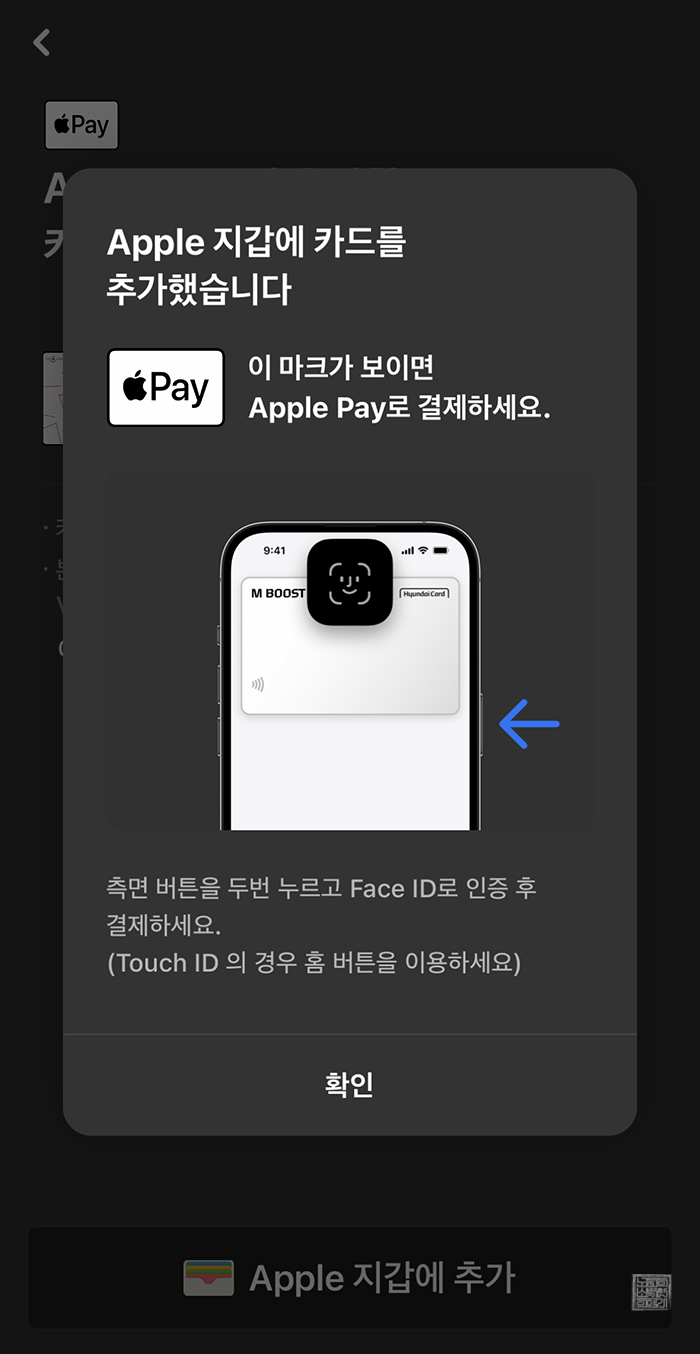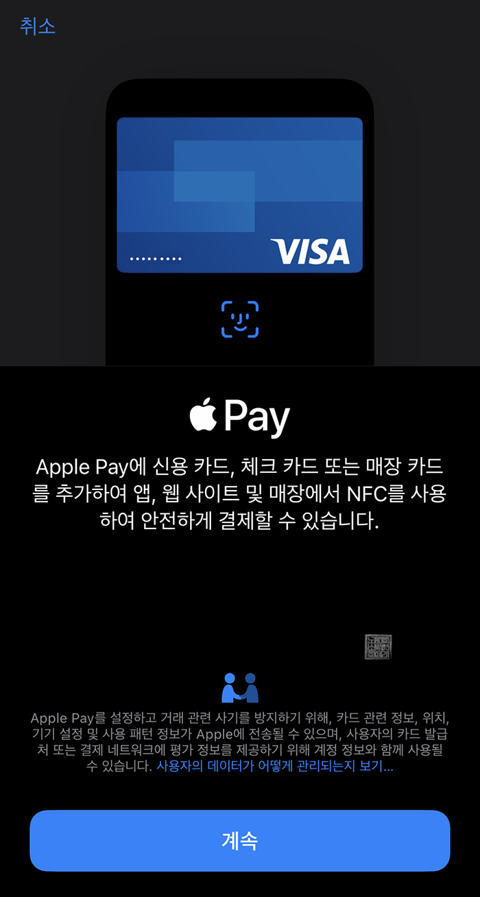 그리고 약관에 동의하기 버튼을 누른 이후 앱의 화면에 따라 '계속' 버튼을 누르면 마침내 애플페이에 사용할 수 있는 카드가 추가된다. 애플페이 가맹점에서는 앱 화면에서 볼 수 있듯이 애플의 사과마크와 함께 'Pay'가 적힌, 다시 말해서 'Apple Pay' 문구가 있으면 따로 지갑에서 카드를 꺼낼 필요 없이 애플페이로 손쉽게 결제가 가능하다.