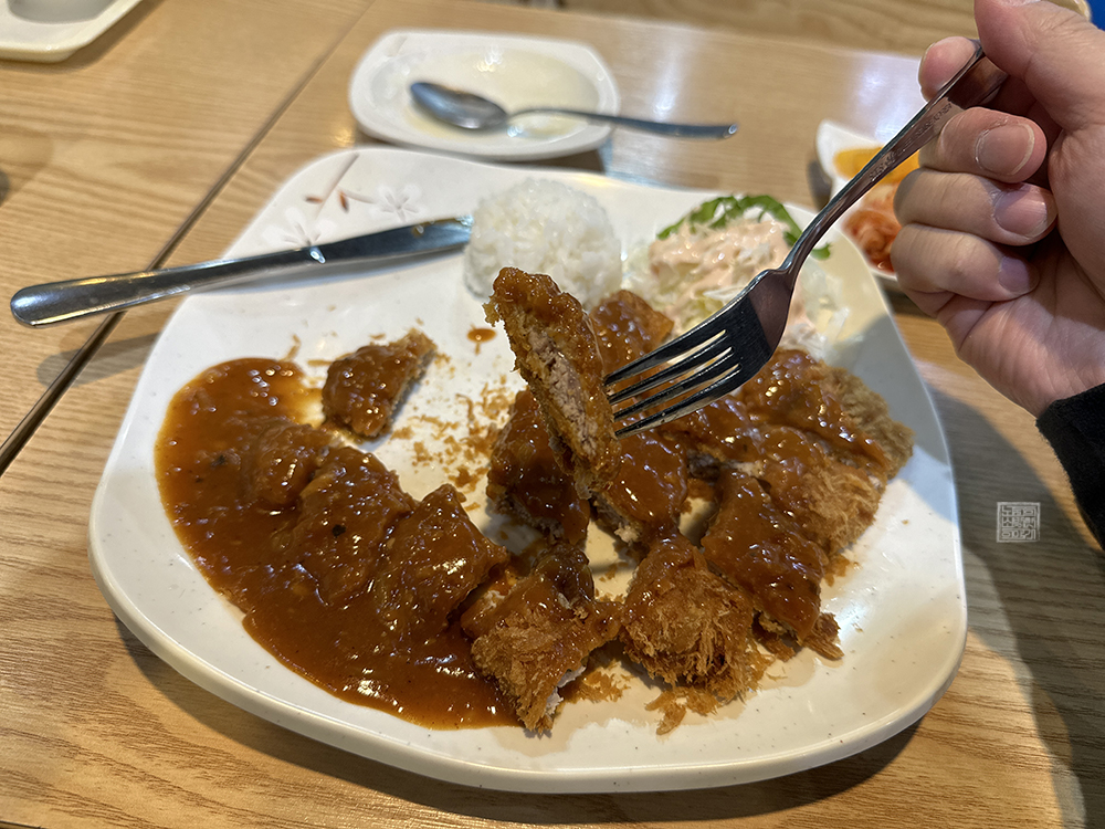 돈까스의 고기도 적당히 두툼한 데다 크기도 있다 보니 함께 나온 밥과 샐러드를 다 먹은 이후에 남은 돈까스를 조금 더 먹을 수 있을 정도였다. 만약 돈까스 양이 부족하다면 3천 원을 추가로 지불해 곱빼기(1.5배)로 주문해서 돈까스를 먹을 수도 있다. 당일 나는 아주 살짝 부족했기 때문에 곱빼기를 시켜 먹을 걸 그랬다며 살짝 후회하기도 했다.