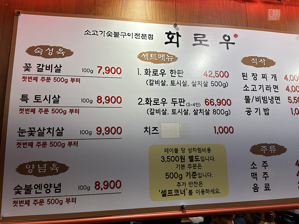 화로우에서 판매하는 숙성 소고기 꽃 갈빗살과 특 토시살, 눈꽃살치살의 가격을 본다면 평소 우리가 평소 볼 수 있는 소고기 숯불구이 전문점보다 상당히 저렴하다는 것을 알 수 있다. 이렇게 가격이 저렴할 수 있는 이유는 당연히 한우를 판매하는 게 아니라 미국산 소고기를 판매하기 때문이다. 한우로는 절대 이 가격이 나올 수 없다.