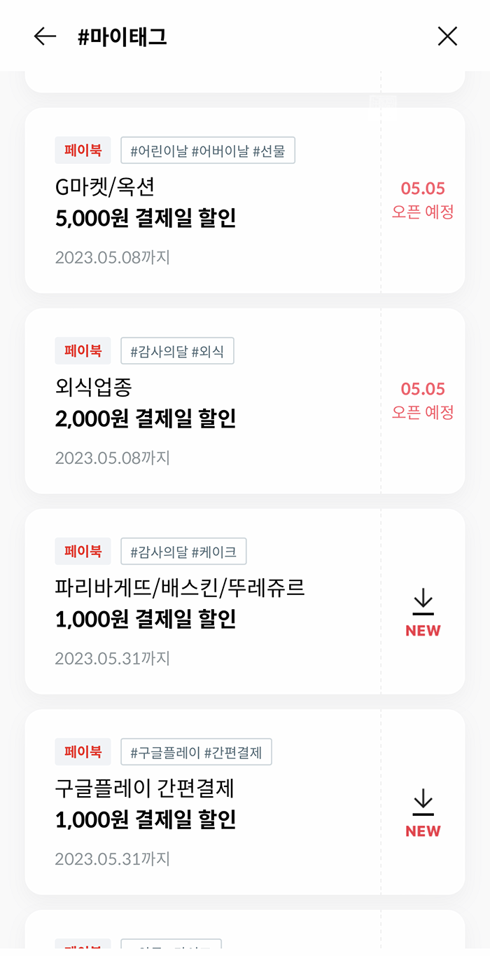 그 이외에도 가정의 달을 맞아 혹시나 케이크를 주문할 사람들을 위해서 페이북 마이태그에서는 파리바게뜨/배스킨/뜌레쥬르 1,000원 결제 할인 혜택도 있으니 아직 마이태그를 하지 않은 혜택이 있다면 꼭 할 수 있도록 하자. 쓸지 안 쓸지 몰라도 일단 할인을 받을 수 있는 혜택은 일단 모두 태그를 해놓는 것도 현명한 방법 중 하나다.