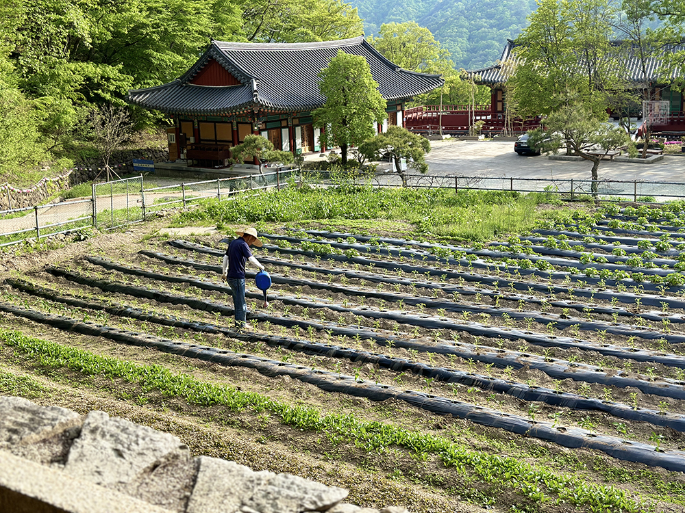 칠불사 한쪽에 마련되어 있는 밭에서는 하동의 자랑이 차를 재배하는 게 아니라 여러 작물을 재배하는 것으로 보였다. 칠불사 내부에 화장실도 마련되어 있기 때문에 외부 주차장에서 칠불사까지 걸어오면서 목을 축이기 위해 마신 물로 화장실을 가고 싶어도 문제가 없고, 내부에는 차를 마실 수 있는 작은 카페도 마련되어 있었다.