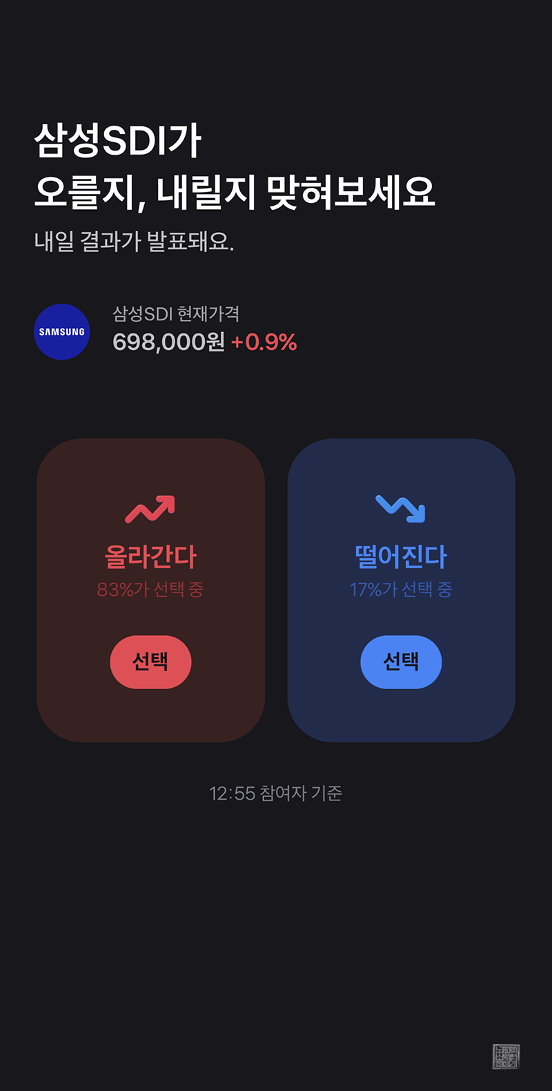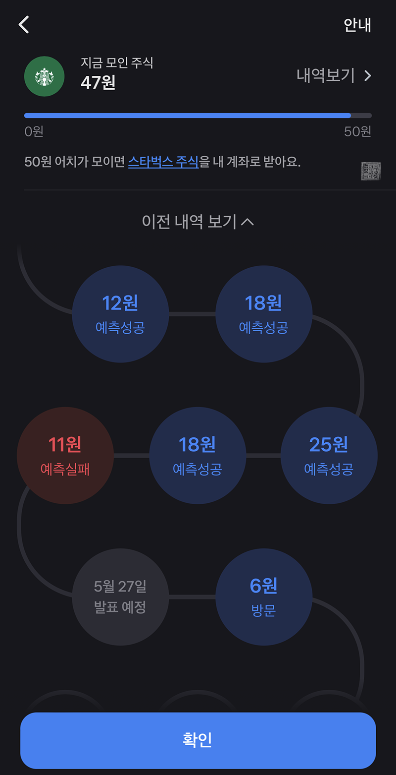 그리고 그냥 출석체크만 하면 재미가 없기 때문에 주식 시장이 열리는 날마다 특정 주식에 대해 오를지 내릴지 선택할 수 있다. 내가 선택한 결과가 실제 주식의 등락과 일치 여부에 따라 무료로 받을 수 있는 주식의 금액이 살짝 커지기도 하고 줄어들기도 한다. 요 며칠 동안 나는 신들린 듯이 맞추다가 아쉽게도 어제는 예측이 빗나가버렸다.