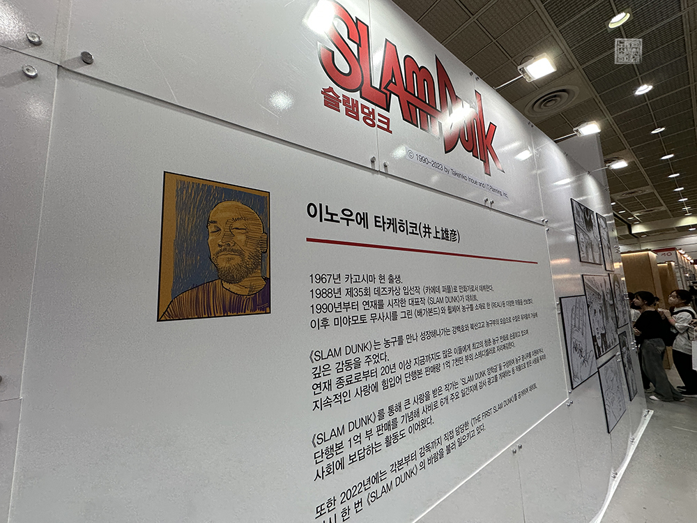 왼쪽으로 먼저 발걸음을 옮기면 조금 떨어진 곳에서 사람들이 북적거리는 부스를 발견할 수 있다. 바로 2023 서울국제도서전에서 슬램덩크 단독관을 운영하고 있는 대원씨아이 부스로, 대원씨아이는 이번에 여러 작품을 동시에 전시하는 것이 아니라 애니메이션 극장판을 통해 사람들의 높은 관심을 받은 <슬램덩크> 하나에 집중을 했었다.