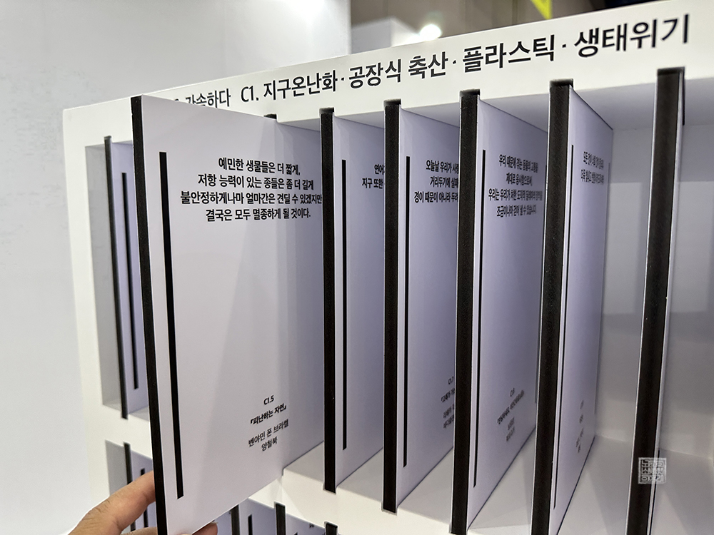 한국에서 가장 아름다운 책이 전시된 곳을 지나면 이제야 비로소 2023 서울국제도서전의 '비인간, 인간을 넘어 인간으로'라는 주제로 정렬되어 있는 다양한 책을 만날 수 있다. 상당한 오묘한 분위기를 자아내는 전시장을 천천히 둘러보면서 이곳에서 만나볼 수 있는 책들을 제목만 천천히 읽어보더라도 깊이 생각을 해볼 수 있었다.