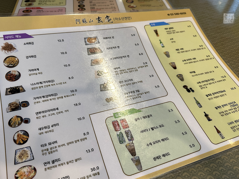 <아소산겐안>이라는 가게의 이름만 보았을 때는 솔직히 이 가게가 어떤 메뉴를 판매하는 가게인지 알 수 없었다. 하지만 조금만 검색을 해본다면 수제 소바와 돈가스를 전문적으로 판매하는 일식 전문점이라는 걸 알 수 있는데, 가게에서 볼 수 있는 메뉴판에는 소바 메뉴와 모둠 메뉴, 밥 메뉴, 돈카츠 메뉴가 굉장히 많았다.