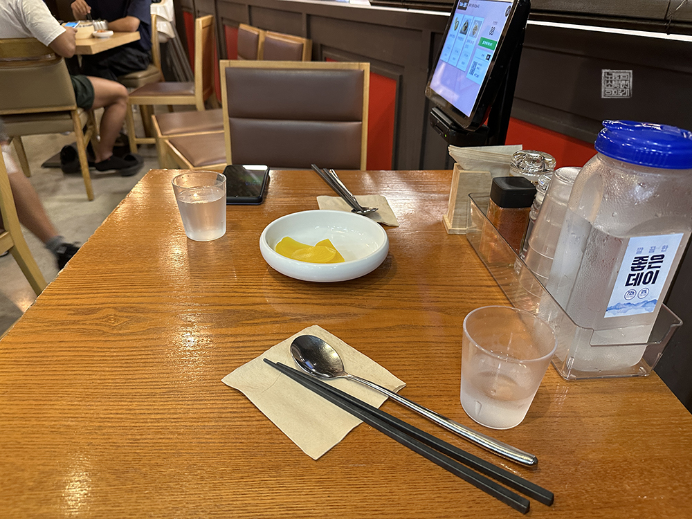 교동 짬뽕 김해 이마트점은 앉은 테입르에서 곧바로 주문과 결제도 할 수 있지만, 단무지와 양파를 비롯해 식기를 모두 셀프 코너에서 직접 가져와야 한다는 불편함도 있다. 어떻게 본다면 이게 비용을 줄일 수 있는 효과적인 방법이기는 해도 크게 효과가 있어 보이지는 않았다. 어쨌든, 먹을 만큼 양파와 단무지를 가져올 수 있는 건 편했다.