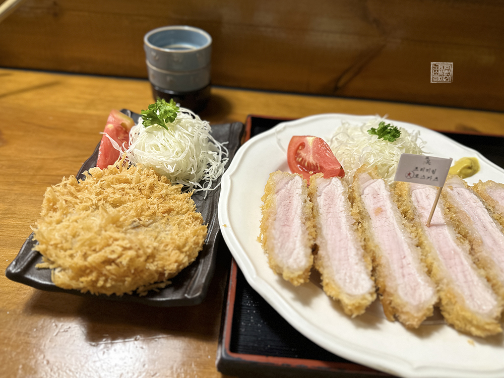 그래서 이번에는 깔끔하게 먹고 싶어서 버크셔 특 로스카츠가 아니라 평범한 로스카츠를 주문하면서 가브리살(지방)과 함께 붙어 있는 돈가스 프리미엄 大 로스카츠를 주문했다. 해당 로스카츠의 가격은 13,000원으로 여기에 기다린 게 아쉬워서 멘치카츠 한 개(3,000원)를 추가 주문해서 도합 16,000원을 점심 한 끼의 비용으로 크게 투자했다.