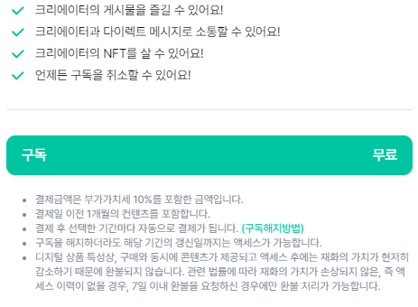*결제를 하였을 경우 자동으로 정기 결제가 되기 때문에 한 달만 결제를 하고자 한다면 정기 결제를 취소할 필요가 있다. 정기 결제를 취소하더라도 한 달 동안은 구독 상태가 지속되기 때문에 구독자 한정 콘텐츠를 감상할 수 있고, 결제를 한 이후 곧바로 취소를 하더라도 환불은 받을 수가 없기 때문에 결제를 할 때는 주의가 필요하다.