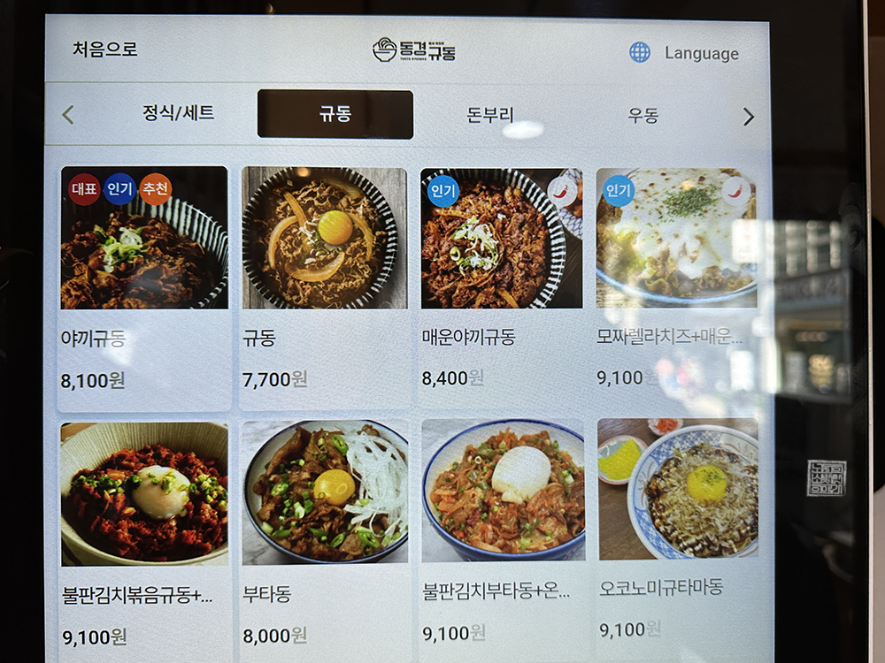 동경규동 내외점 매장의 규모는 그렇게 큰 편은 아니었지만, 4인 테이블을 기본 사이즈로 해서 1인이 가게를 찾아도 부담 없이 앉아서 먹을 수 있는 테이블도 마련되어 있었다. 주문은 매장에서 키오스크를 이용해 사전 주문과 결제를 할 수 있는데, 메뉴를 본다면 정식/세트 메뉴부터 시작해서 규동과 돈부리 등 다양한 메뉴가 있었다.