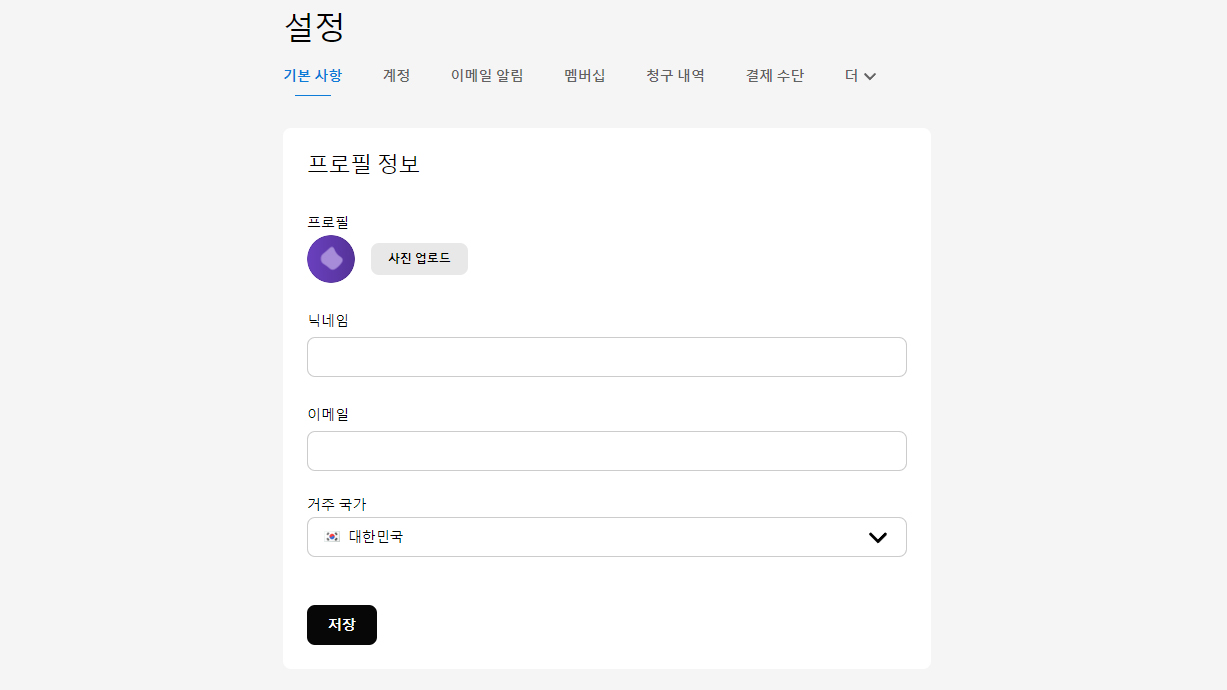 패트리온을 이용하기 위해서 이메일 주소로 가입했을 경우에는 이메일 주소 인증이 필요하다. 간혹 스팸 메일함으로 패트리온 인증 메일이 오는 경우가 있으니 잘 참고하여 인증을 진행하도록 하자. 인증 메일에 첨부된 링크를 통해 인증을 마친다면, 위 사진처럼 간단히 기본 사항에서 닉네임과 이메일 정보를 입력해야만 한다.