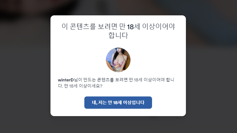 그 과정을 마쳤다면 이제 크리에이터 검색을 통해서 내가 보고 싶은 패트리온 크리에이터를 검색하면 된다. 우리는 '겨우디' 님의 콘텐츠를 보기 위해서 패트리온에 가입을 진행했으니, 검색창에 'winterD'를 검색한다면 위에서 첨부한 화면을 볼 수 있다. 수위가 높은 콘텐츠가 많다 보니 만 18세 이상을 묻는 팝업창을 마주할 수 있다.