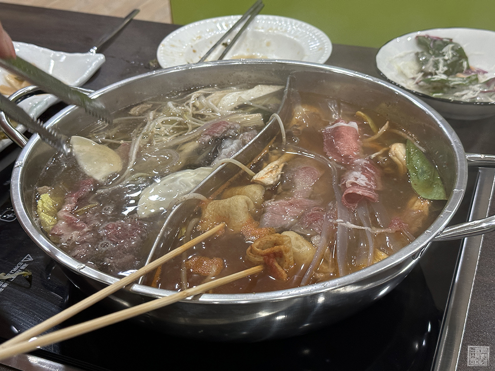 셀프 코너에서 샤브샤브 재료를 가지고 왔으면 육수에 넣어서 평범히 샤브샤브처럼 먹으면 된다. 나는 고기를 넣어서 고기를 먹은 이후 야채와 다른 재료를 넣어서 천천히 먹고 싶었는데, 어머니는 일단 가지오 온 것을 몽땅 다 넣어버리셨다. 덕분에 사진에서 볼 수 있는 샤브샤브의 모습을 본다면 이게 잡탕인지 샤브샤브인지 알 수가 없다.