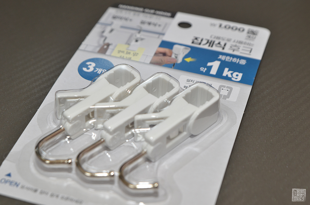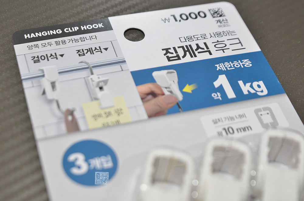 처음에는 지금 씽크대에 해둔 것과 마찬가지로 빨래집게를 추가로 구매해서 사용하는 걸 생각했었는데, 다이소에서 '다용도로 사용하는 집게식 후크'를 본 이후 딱 이거다 싶었다. 걸이 방식과 집게 방식 양쪽으로 활용이 가능한 집게식 후크는 씽크대에서 수세미를 말리는 용도만 아니라 다양한 방면에서도 충분히 활용할 수 있어 보였다.
