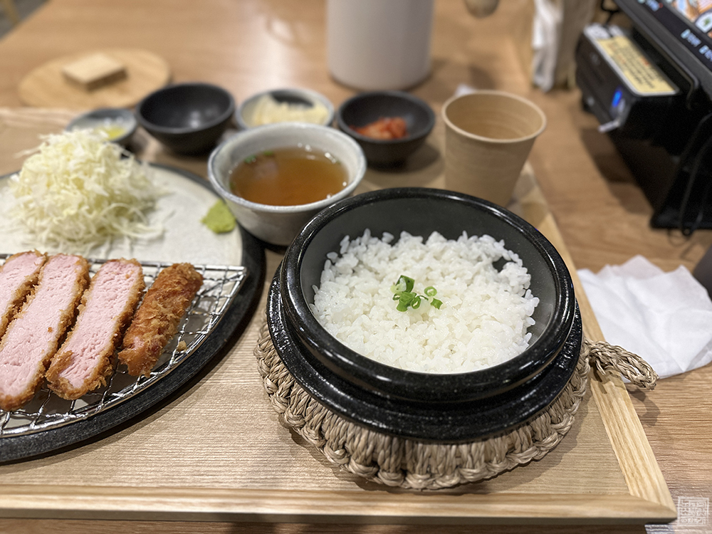 등심 카츠를 주문하고 천천히 가게를 둘러보고 기다리다 보니 마침내 주문한 등심 카츠가 나왔다. 등심 카츠를 메인으로 몇 가지 반찬과 함께 기름장(트러플 오일), 와사비, 핑크 소금, 김치, 단무지 등이 골고루 구성되어 있었다. 여기까지는 평범한 돈가스 전문점과 다를 게 없지만, 다른 점이 있다고 한다면 밥이 솥밥이었다는 점이다.