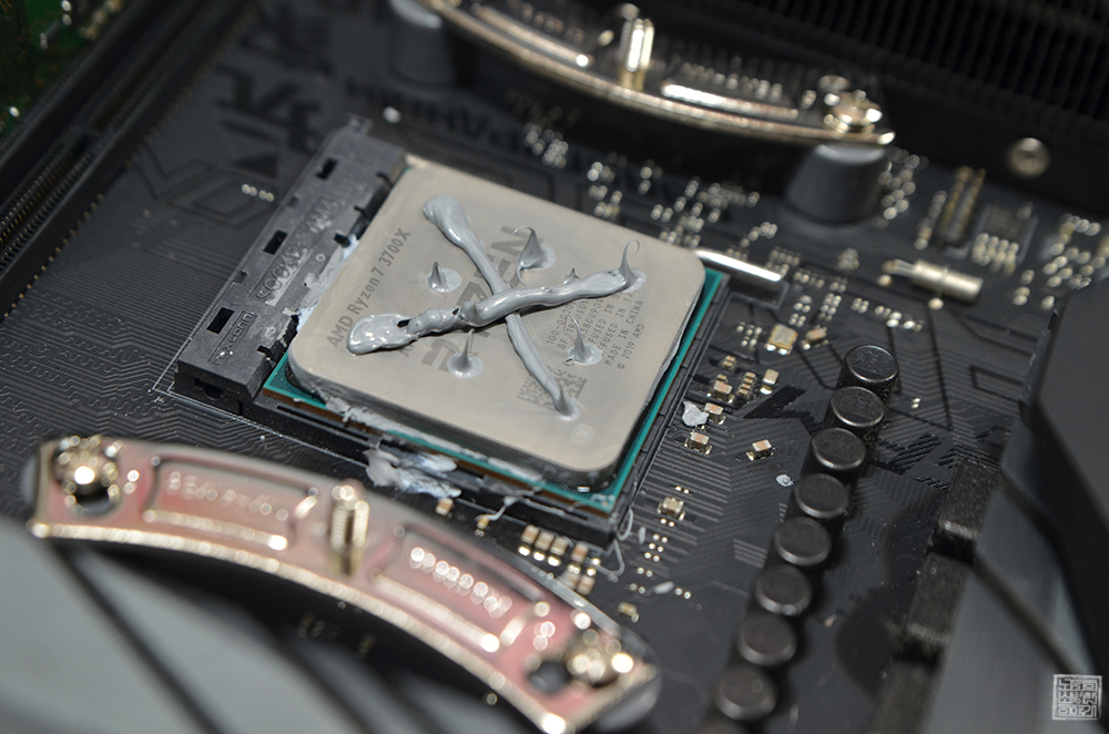 어쨌든, 옥타코어 8코어에 16 쓰레드를 지원하는 제품이다 보니 지금까지도 큰 불편함 없이 잘 사용하고 있기 때문에 새 컴퓨터를 맞추는 건 아직 하지 않을 생각이다. 어쨌든, 위 사진처럼 기존에 있던 써모랩 CPU 쿨러를 제거한 이후 다소 말라 있었던 서멀 구리스를 닦고 새롭게 도포를 해주었다. 서멀 도포는 역시 국룰인 당구장 표시다.