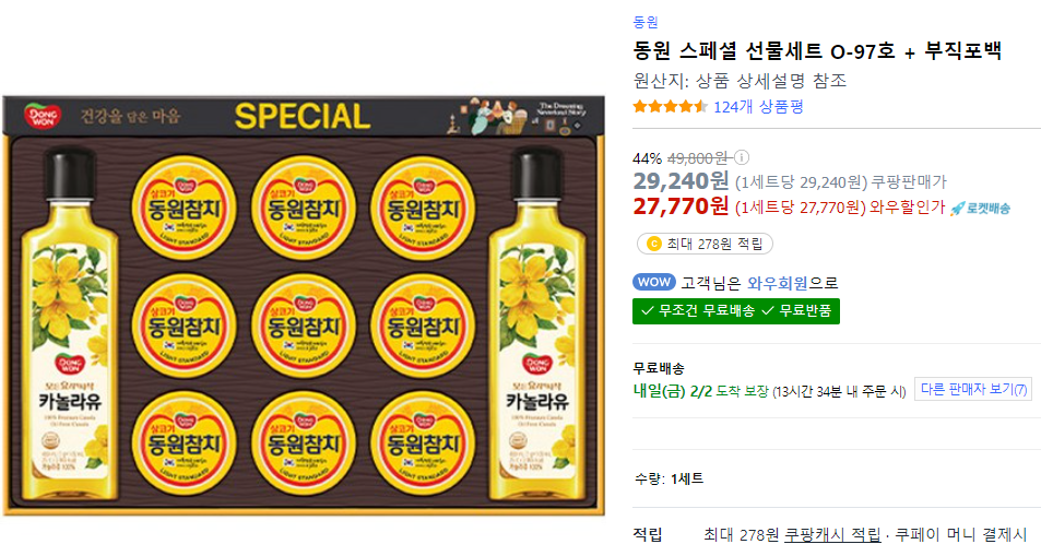 쿠팡에서 판매하는 동원 스페셜 선물 세트 O-97호는 쿠팡에서 배송하는 상품이기 때문에 오늘 주문한다면 바로 내일 받아볼 수 있다. 더욱이 27,700원이라는 가격은 쿠팡 와우 회원을 대상으로 한 금액이기 때문에 29,240원 보다 더 저렴하게 구매하고자 한다면 쿠팡 와우 회원일 필요가 있다. 이 정도면 꽤 혜택이 좋은 편이 아닐까?