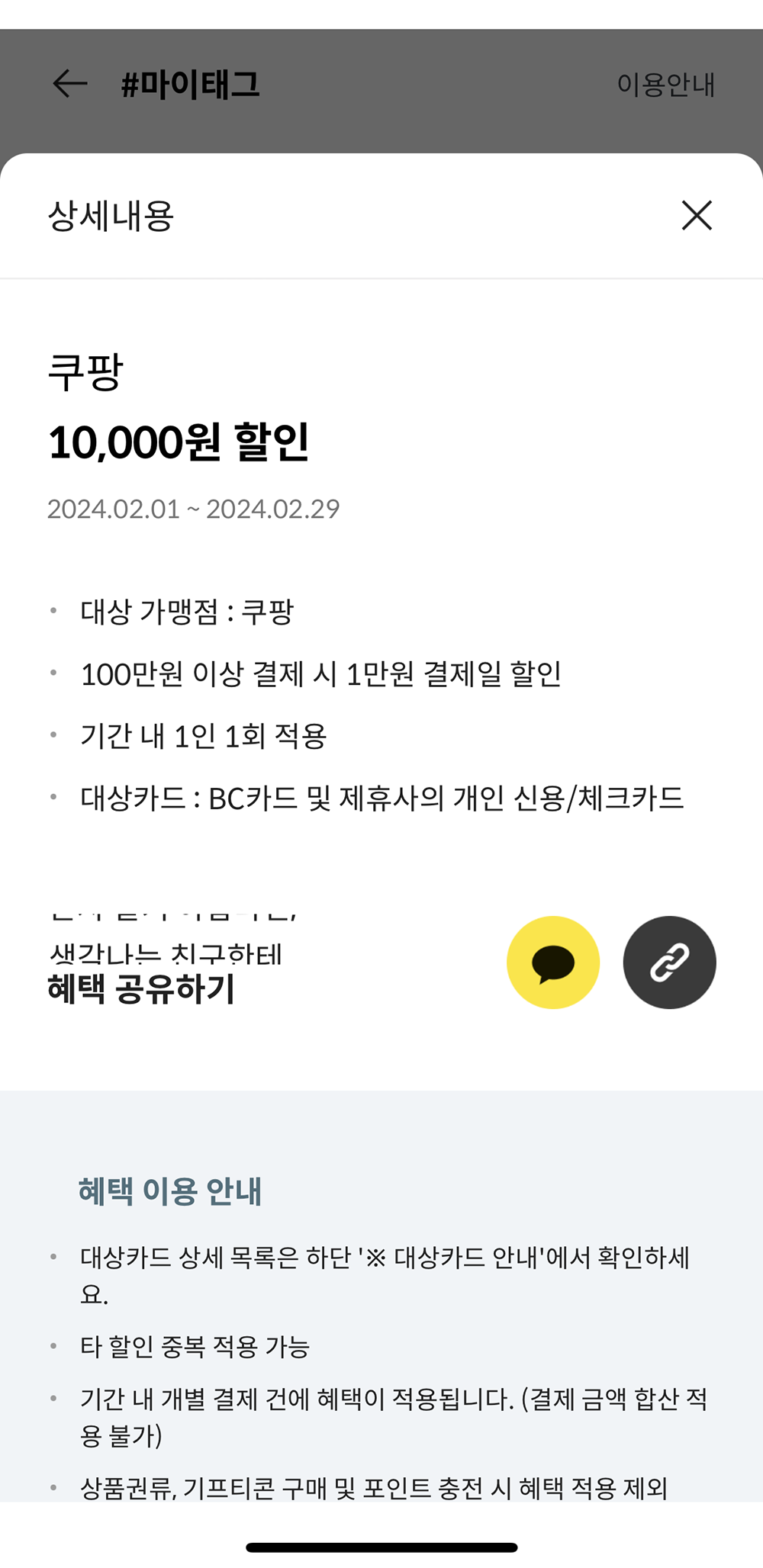 BC카드 페이북 2월 마이태그 유튜브 프리미엄 쿠팡 할인 정보