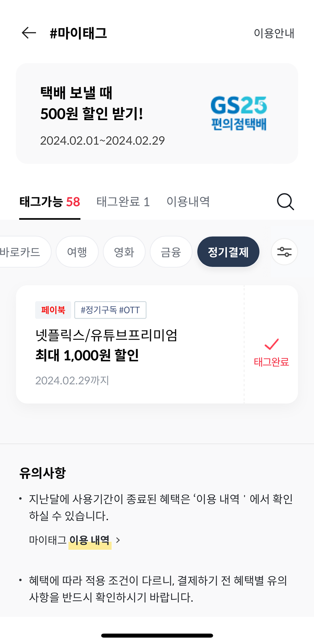 나 역시 넷플릭스/유튜브 프리미엄 1천 원 할인 마이태그는 매달 놓치지 않기 위해서 날이 바뀌면 열심히 클릭하고 있다. 지난 2024년 1월에는 1월 1일이다 보니 잠시 한눈을 팔다가 마이태그를 놓치고 말았지만, 이번 2월에는 놓치지 않고 혜택을 클릭했다. 하지만 쿠팡 주말 2천 원 할인 마이태그를 놓친 건 굉장히 아쉬운 부분이었다.