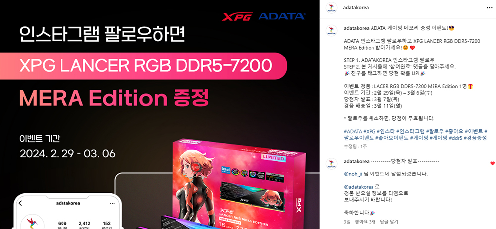 adata korea 공식 계정에서 진행했던 인스타그램 팔로우 이벤트에 당첨이 되어 나는 생각지 못한 선물을 받을 수 있게 되었다. 해당 선물은 컴퓨터를 스스로 조립해서 게이밍 컴퓨터 혹은 작업용 컴퓨터를 사용하는 사람이라면 누구나 욕심을 낼 수 있는 ADATA에서 생산하는 랜서 RGB 메라 에디션 DDR5-7200 32GB(16GBX2) 세트였다.