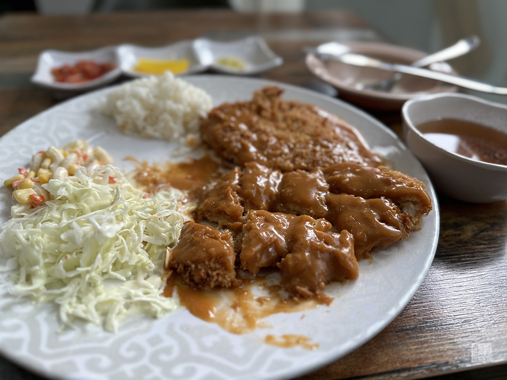 그렇게 크림스프를 천천히 다 먹었을 때 주문한 생돈까스 곱빼기가 나왔다. 곱빼기로 주문했기 때문에 돈까스는 기본 크기 돈까스 하나와 함께 기본 크기 돈까스 절반 정도 크기의 돈까스가 하나 더 올려져 있었고, 밥도 충분히 있었기 때문에 부족할 염려는 없어 보였다. 양배추 샐러드와 마카로니도 부족하지 않은 양이었다고 생각한다.