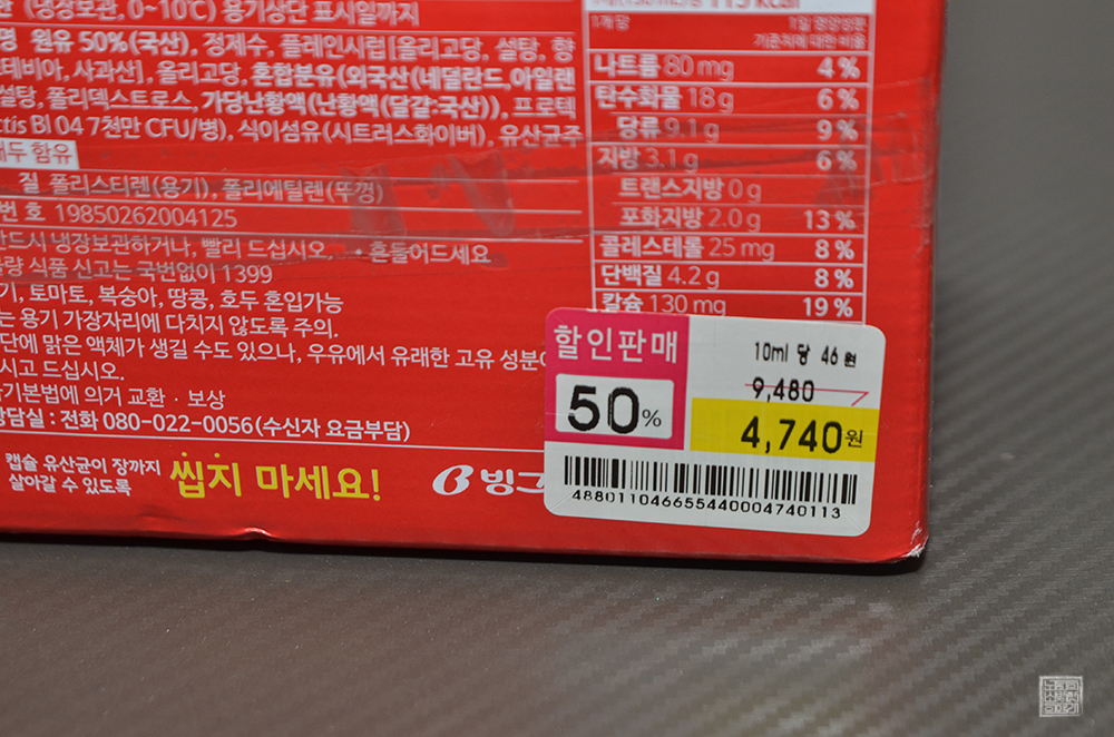 얼마 전 이마트에 장을 보러 갔다가 할인 제품 코너에 빙그레 요플레 1000배 닥터캡슐 프로바이오틱스 플레인 제품이 소비 기한이 임박해 50% 할인된 가격으로 판매되는 것을 보았다. 제품은 많이 남아 있지도 않았고, 딱 한 개만 남아 있었기 때문에 나는 망설이지 않고 곧바로 해당 제품을 카트에 담아서 구매했다.