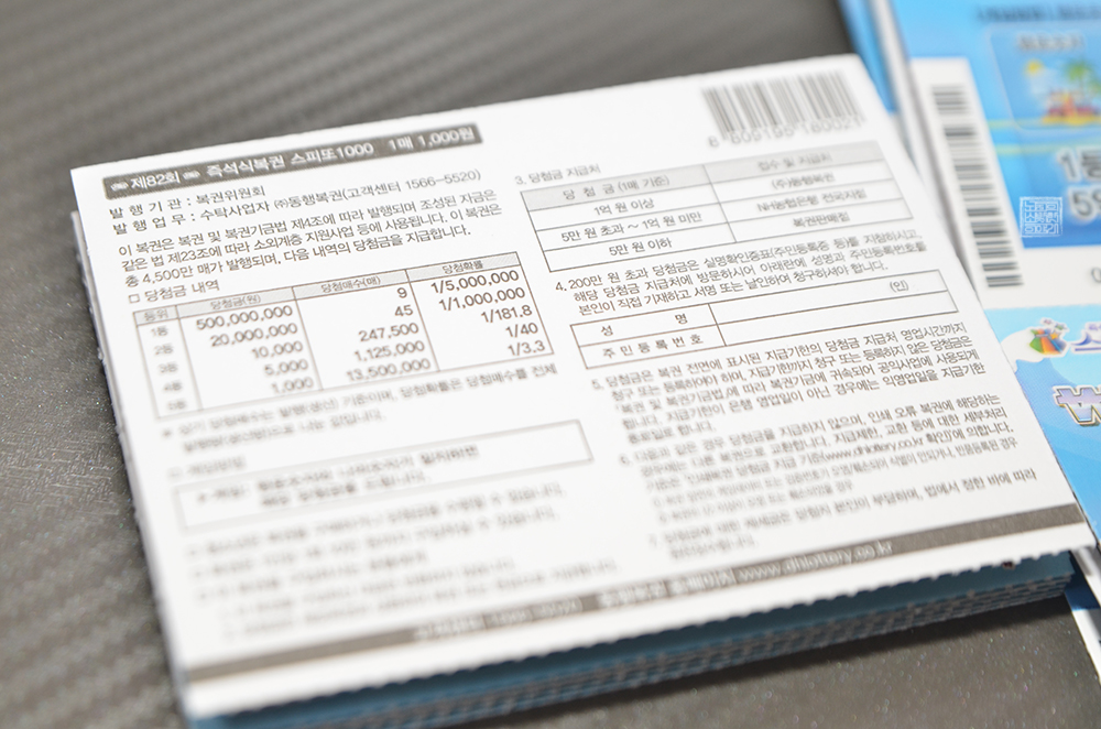 스피또1000의 1등은 약 5억 원의 당첨금을 받을 수 있는데, 당첨 확률은 1/5,000,000으로 1등 당첨 복권은 총 9장이 있다. 정말 말도 안 되게 낮은 수치라고 해도 분명히 1등 당첨 복권은 존재하고 있고, 현재 동행복권 홈페이지에서 확인할 수 있는 스피또1000 82회 상위등위 잔여수량을 본다면 1등 5억 원은 한 장을 누군가가 가져갔다.