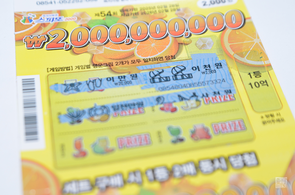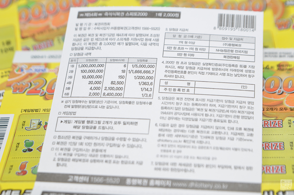 이번에 내가 구매한 제54회 스피또2000 즉석 복권은 본격적으로 시작된 여름을 맞아 상큼한 과일과 디저트의 그림이 그려져 있다. 복권 색깔이 노란색이다 보니 꽤 아기자기한 느낌으로 디자인이 잘 되었다고 생각하는데, 사실 복권은 디자인이 중요한 게 아니라 내가 구매한 복권이 과연 몇 등에 당첨될 수 있는지가 가장 중요하다.