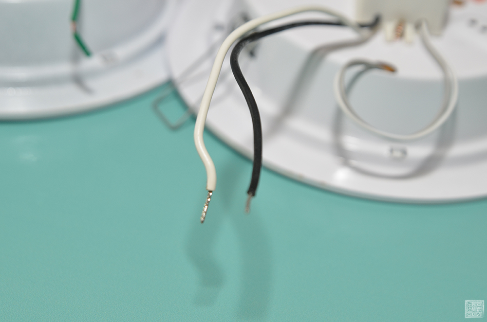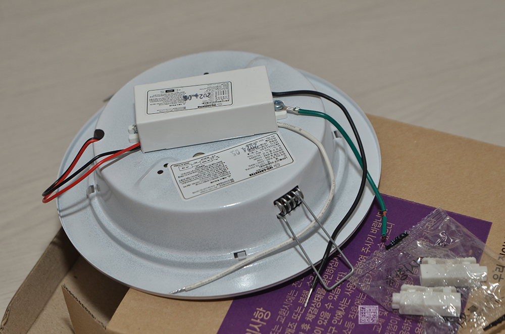 제품은 아주 단순하게 본품과 함께 전원선을 연결하기 위한 커넥터 두 개가 들어 있는 게 전부였다. 나는 해당 매입등의 전원선을 메인 전원선과 연결하는 방법을 설명한 설명서가 없다는 사실에 놀랐다. 보통 LED 전등이라고 해도 간단히 설명서가 있기 마련일 텐데… 글을 읽을 수 있는 건 상자에 표기된 주의사항 한 가지뿐이었다.