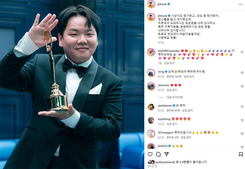 여행 유튜버 곽튜브 청룡시리즈 예능 신인상 수상하다