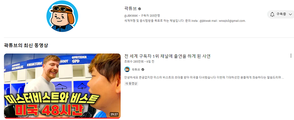 당시에 그는 180만 구독자가 넘어가는 여행 유튜버였지만, 지금은 200만 구독자가 넘어가는 여행 유튜버가 되었을 뿐만 아니라 한국 유튜버 중에서 처음으로 전 세계 1위 구독자 채널이자 미국의 유튜버 미스터 비스트 채널에 출연한 유튜버가 되기도 했다. 어떻게 본다면 그는 유튜브 채널을 통해 가장 크게 인생을 바꾸었다고 말할 수 있다.