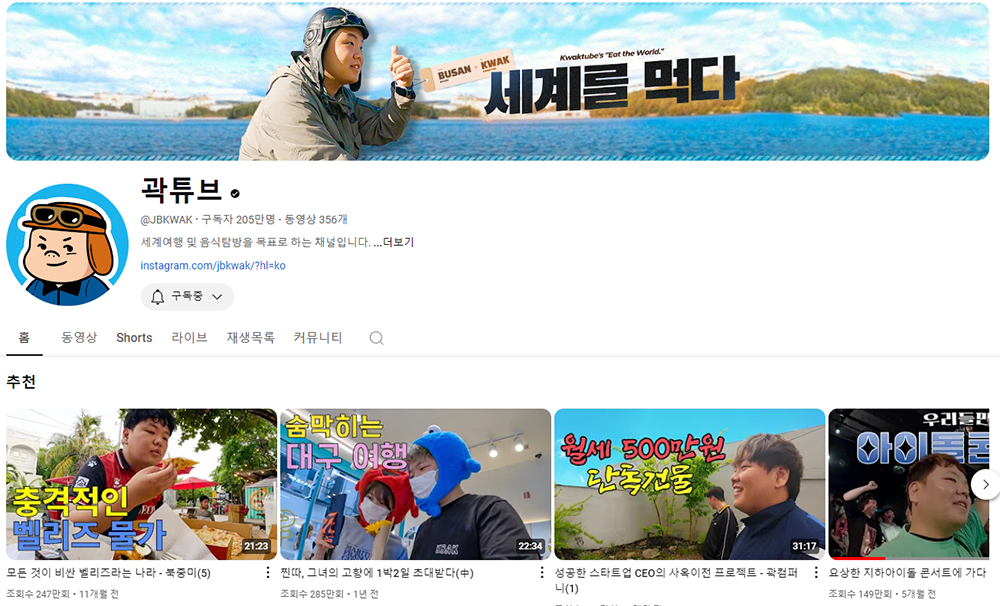 나와 같은 사람들에게 곽튜브는 그야말로 모범적인 유튜브 크레이터라고 생각한다. 곽튜브 채널을 통해 볼 수 있는 영상은 도파민을 자극하는 영상이 아닌데도 계속 보게 되는 매력을 갖추고 있다. 평소 사람 이야기와 여행 이야기를 좋아하는 사람에게 곽튜브 채널을 적극적으로 추천하고 싶다. 최근에 업로드된 영상은 아래에서 볼 수 있다.