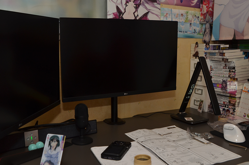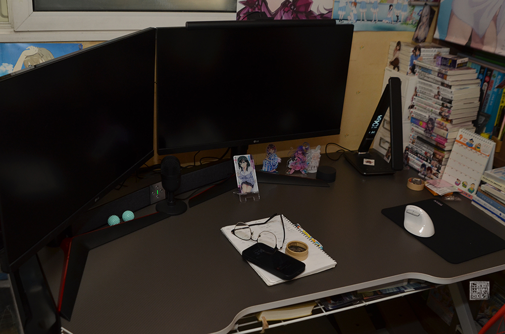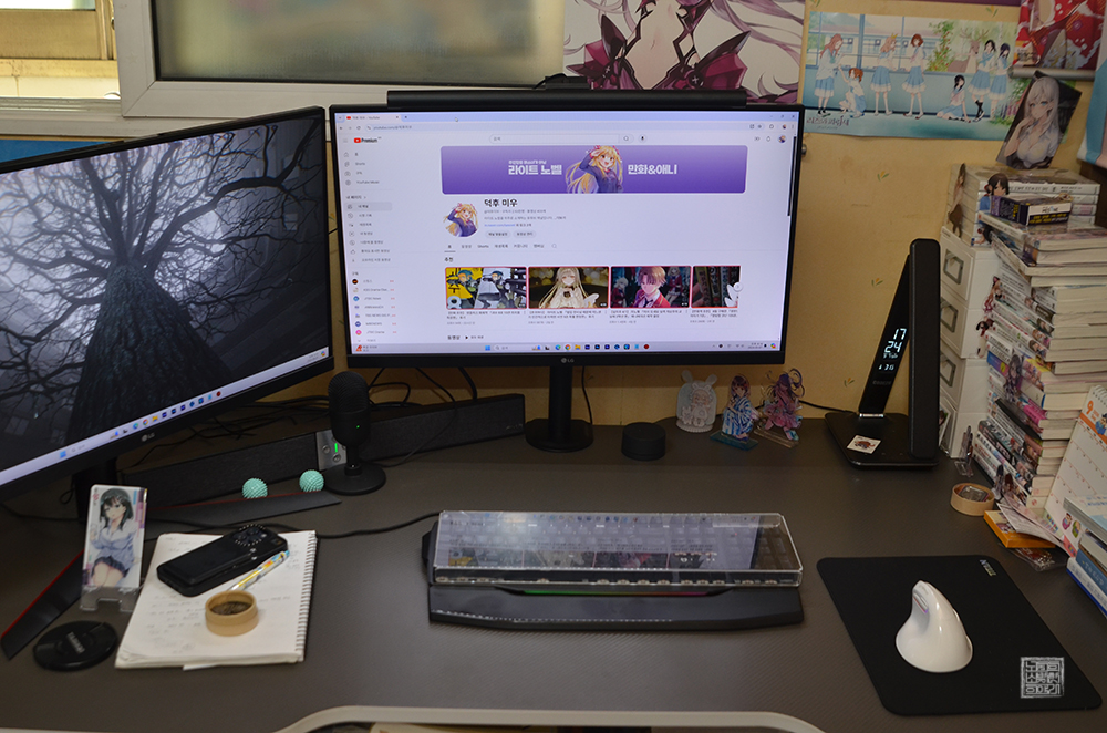 나는 집에서 듀얼 모니터를 사용하다 보니 책상을 1600 사이즈로 사용해도 솔직히 공간이 그렇게 넓지 않다. 특히, 내가 사용하는 LG 울트라기어 게이밍 모니터(144Hz)는 모니터 스탠드가 조금 크게 나와 있다 보니 사진처럼 많은 공간을 차지한다. 더 아쉬운 점은 모니터를 지지하는 힘이 약해서 항상 모니터가 기울어진다는 점이었다.