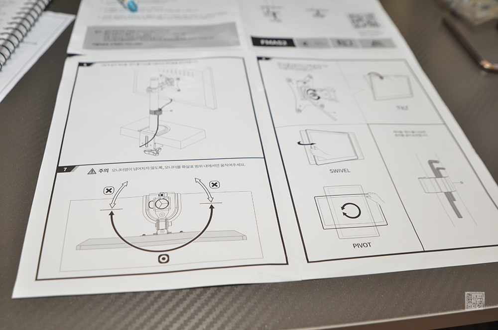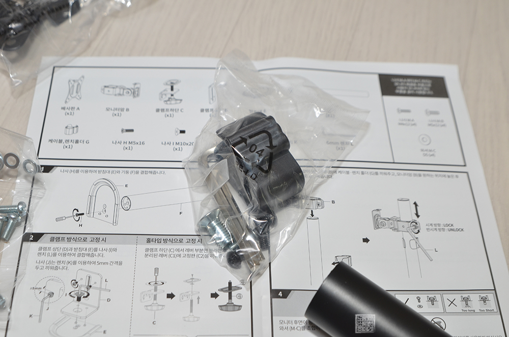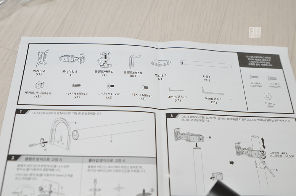나는 조립이 서투른 사람이다 보니 잘할 수 있을까 걱정도 했다. 하지만 관절 형태로 되어 있는 모니터암과 달리 카멜마운트 스탠드형 싱글 FMAS2 모니터암은 기둥에 받침대를 연결해 조립한 이후 모니터암을 설치할 책상에 자리를 잡은 이후 아래에서 클램프를 연결하면 조립의 절반은 끝나는 제품이었다. 단, 여기서 문제점이 있었다.