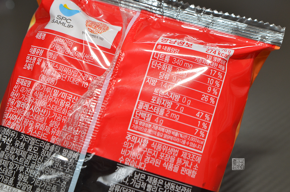 이브이의 카라멜 땅콩 미니샌드의 칼로리는 274칼로리로 총내용량이 76g이기 때문에 간식으로 먹거나 가벼운 아침으로 먹기에 나쁘지 않았다. 더욱이 이 빵은 아래 사진에서 볼 수 있듯이 커다란 빵 한 개가 아니라 네 개의 샌드로 나누어져 있어서 빵을 혼자 먹거나 친구들과 나누어 먹기에도 좋았다.