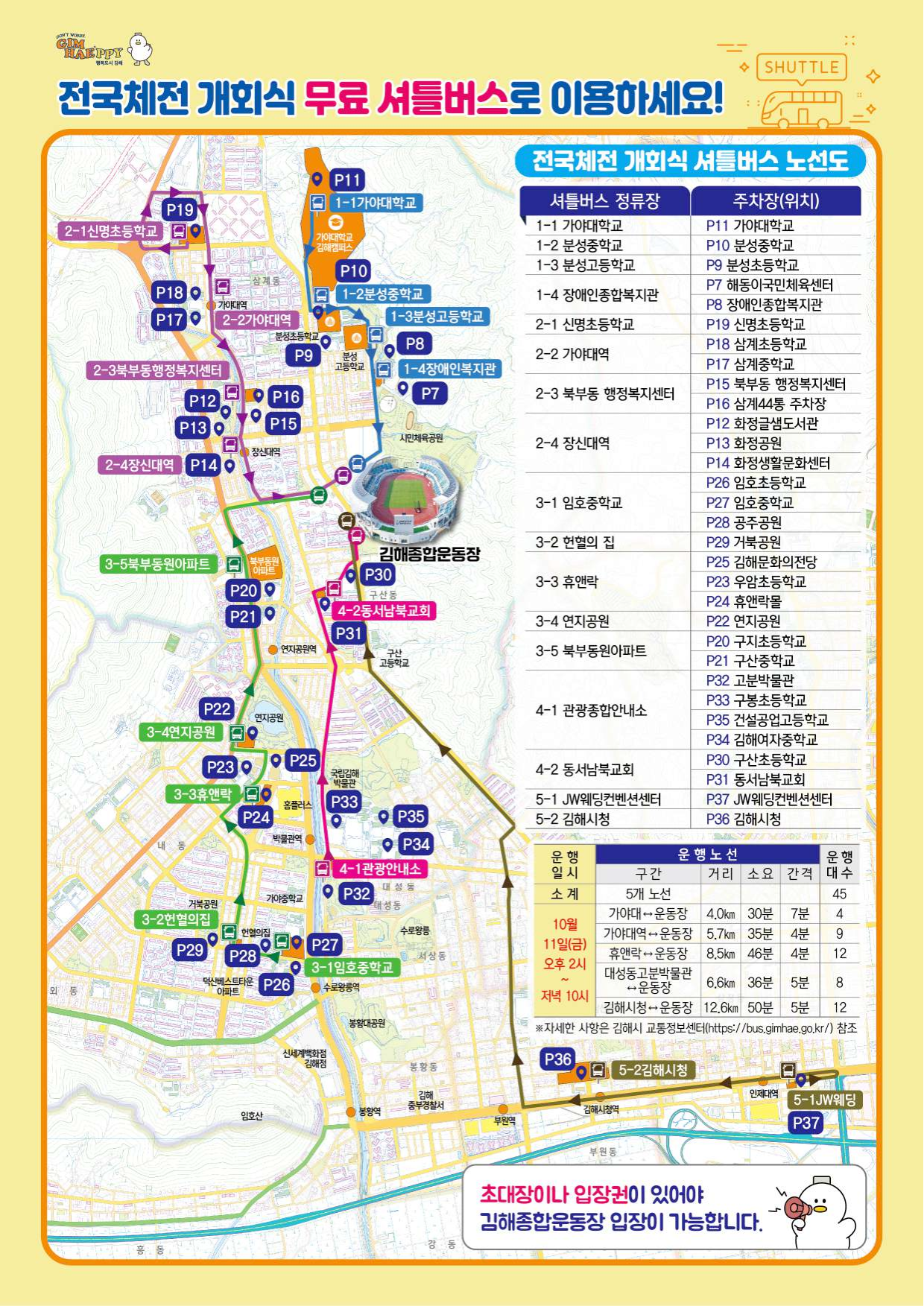 이번 전국체전을 위해서 김해시에서는 무료 셔틀버스를 오는 10월 11일(금) 오후 2시부터 제공한다. 노선은 총 5개로 나누어져서 부산 김해 경전철 가야대역과 운동장을 왕복하는 버스와 함께 휴앤락, 대성동 고분박물관, 김해시청에서 출발하는 무료 셔틀버스를 짧은 간격으로 이용할 수 있어 큰 불편함이 없을 것으로 보인다.