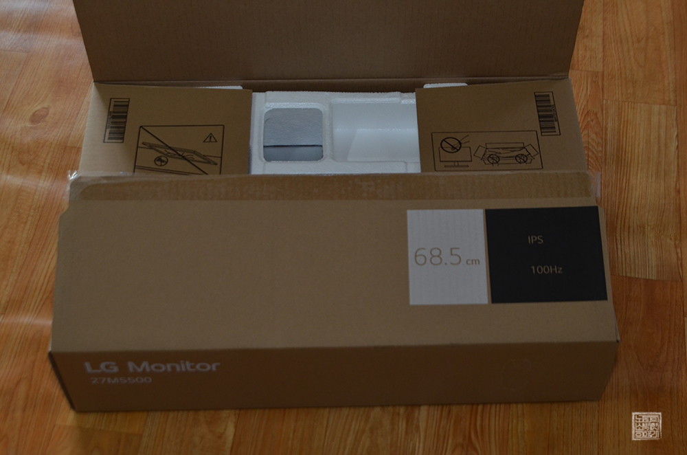 LG전자 FHD 모니터 27MS500 모델의 구성품은 모니터 본체와 함께 스탠드, 그리고 스탠드와 본체를 연결할 수 있는 나사와 데스크톱과 연결할 수 있는 HDMI 케이블이 한 개와 전원 어댑터가 들어가 있었다. 전원 어댑터는 아래에 첨부한 사진에서 볼 수 있듯이 다소 부피가 크다는 게 조금 단점이었다.