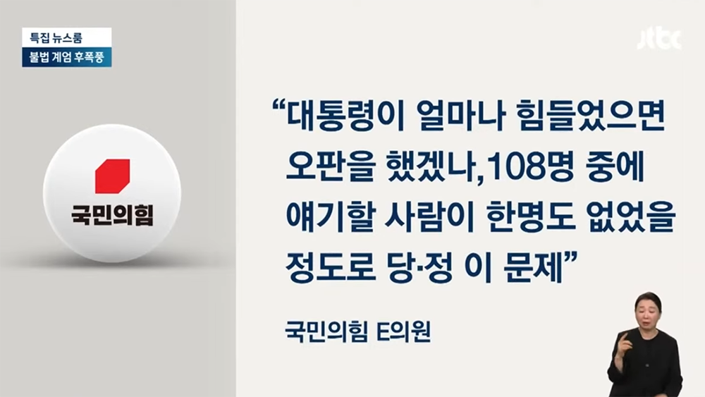 더욱이 어처구니 없게도 국민의힘 소속 국회의원들은 대통령을 옹호하면서 "대통령이 얼마나 힘들었으면 오판을 했겠나, 108명 중에 얘기할 사람이 한 명도 없었을 정도로 당·정이 문제."라고 주장했고, 어떤 국민의힘 의원은 "탄핵을 두 번 당한 당을 누가 찍겠나. 보수정당은 '멸문지화'를 당할 것"이라고 언급하기도 했었다.