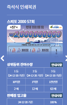매일 같이 잔돈으로 꾸준히 구매하고 있는 즉석식 인쇄복권 스피또2000 57회는 현재 12월 20일을 기준으로 판매점 입고율이 100%를 기록했다. 즉, 생산된 복권이 복권 판매점에 모두 제공되었다는 뜻으로, 아직 남아 있는 1등부터 시작해서 3등 당첨 복권이 어디에 숨어 있을지 모른다. 이건 무조건 사야만 하는 복권이 되었다.