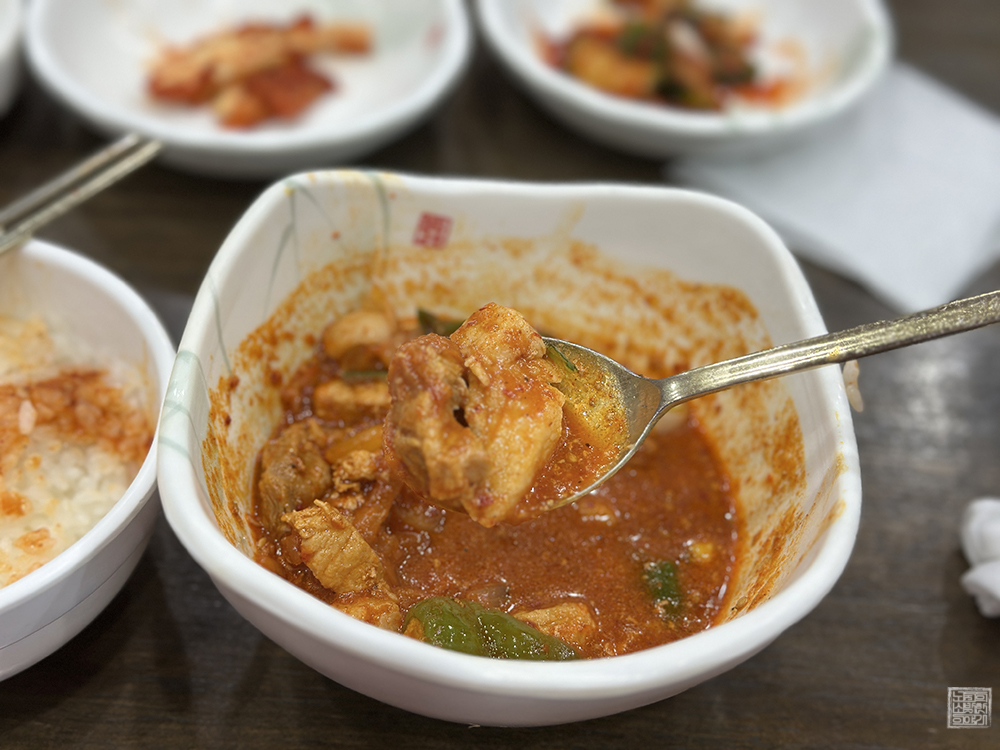 토박이 식당 내에서 판매하는 김치찌개보다 국물이 더 진할 뿐만 아니라 두부 대신 땡초를 넣어서 간을 잡기 때문에 다소 매운맛을 즐길 수 있는 메뉴다. 특히, 나처럼 남자라면 매콤한 국물과 고기를 밥과 함께 먹으면 진짜 밥이 많아도 모자랄 정도로 맛있게 먹을 수 있다. 그래서 종종 공깃밥을 하나 더 추가해서 먹기도 한다.
