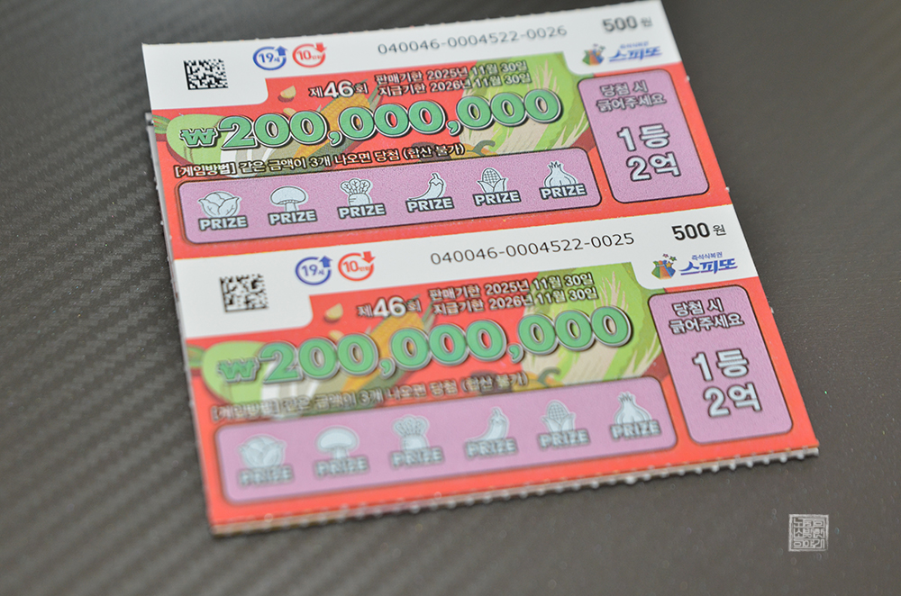한 장에 500원을 주고 구매할 수 있는 스피또500 46회의 2등은 1백만 원으로, 시중에 총 40장이 뿌려지기 때문에 작은 행운으로 2등 1백만 원을 기대해보는 것도 나쁘지 않다고 생각한다.