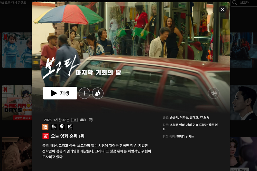 영화관을 통해서 야심 차게 개봉했던 송중기 주연 영화 <보고타 : 마지막 기회의 땅>은 큰 소득을 거두지 못한 상태에서 막을 내리고 말았다. 하지만 넷플릭스를 통해 영화 <보고타>가 업로드되었을 때는 오늘 영화 순위 1위를 기록할 정도로 커다란 반향을 불러일으킬 정도로 사람들이 영화를 흥미롭게, 치열하게 보았다.