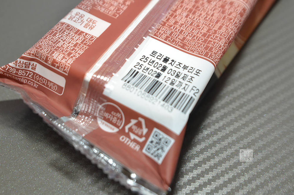 지난 2월 10일(월)을 맞아 주문했던 삼립 트리플 치즈부리또의 뒷면을 본다면 제조 날짜와 함께 소비기한이 적혀 있었다. 제조 날짜는 2월 3일, 소비기한은 2월 12일(수)까지로 소비기한 자체는 넉넉한 편이었다. 그리고 이 제품은 냉장 보관 제품이다 보니 꼭 냉장 보관을 하고 포장지를 뜯으면 최대한 빠르게 먹어야 하는 제품이다.