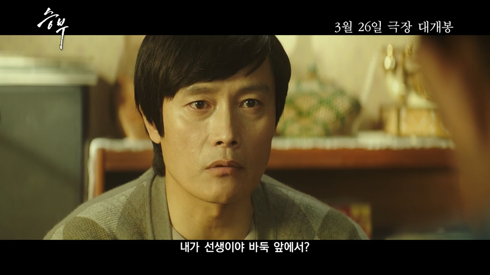 현재 이병헌을 중심으로 공개된 영화 <승부> 예고편을 본다면 이병헌은 자신이 제자로 기른 유아인과 프로 무대에서 승부를 벌이게 된 것을 알 수 있다. 이병헌의 지인으로 등장한 고창석은 "이러다 진짜 창호(역 유아인)에게 잡아 먹히는 거 아니야?"라고 너스레 웃으면서 걱정하지만, 이병헌은 "아직 10년은 이르지."라며 자신만만해한다.