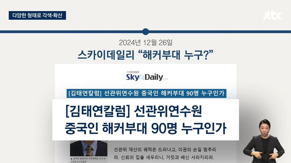 윤석열을 지지하는 극우 세력들이 퍼뜨린 가짜 뉴스 중 하나는 윤석열의 불법 계엄 당시 선관위 숙소에서 중국인 해커 부대를 체포했다는 이야기였다. 이 이야기의 출발점은 불법 계엄 때 파견되었던 군 부대원들이 선관위 직원들을 불법 감금했던 사건을 바탕으로 극우 세력들이 망상을 덧붙여 퍼뜨린 가짜 뉴스였다.