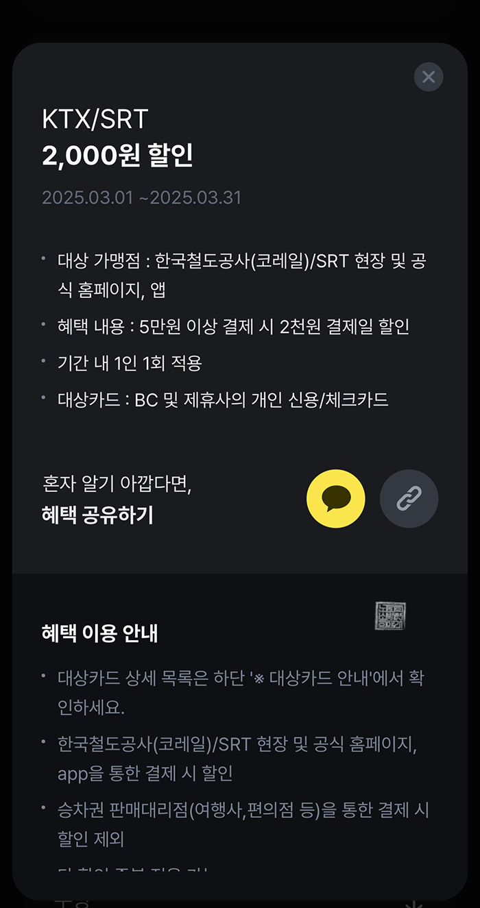 오는 2025년 3월을 맞아 공개된 페이북 마이태그 할인 혜택을 보니 KTX/SRT 2천 원 할인 혜택도 추가되어 있었다. 이게 이전에도 있었는데 내가 발견하지 못했던 건지는 모르겠지만, 오늘날 많은 사람이 출퇴근 수단으로 이용한다는 KTX/SRT를 한국철도공사(코레일) 공식 홈페이지와 앱에서 5만 원 이상 결제 시 2천 원 할인을 받을 수 있었다.