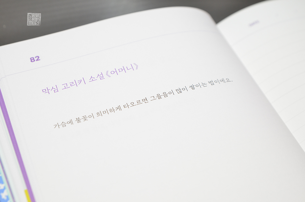 책의 구성을 보면 첨부한 사진에서 볼 수 있듯이 한쪽 면에 글이 수록되어 있고, 다른 한쪽 면에 필사를 해볼 수 있는 공간이 마련되어 있다. 줄 간격이 너무 빽빽하지도 않고 너무 넓지도 않아서 적당히 연필이나 샤프로 필사하기 딱 좋았다. 물론, 평소 글씨를 예쁘게 쓰지 못하는 사람들은 다소 망설여질지도 모른다.