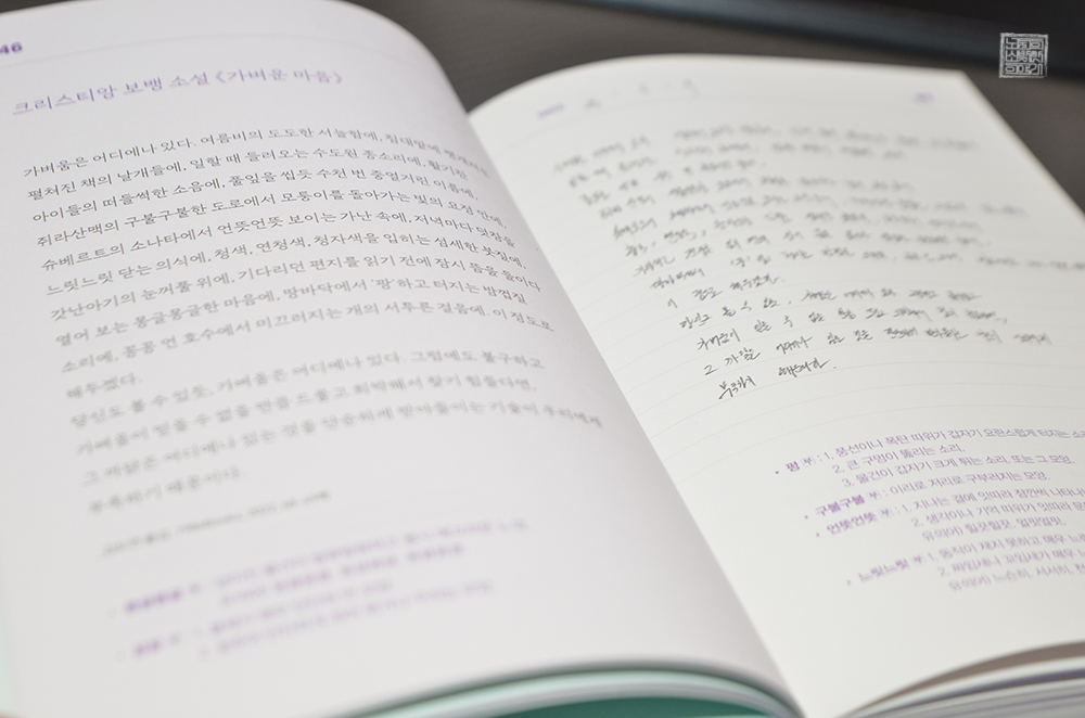 우리가 인스타그램 등 여러 채널에서 볼 수 있는 필사 콘텐츠(캘리그라피를 포함하여)는 잘 모르는 사람이 보더라도 정말 글씨가 예뻤기 때문이다. 하지만 <하루 한 장 나의 어휘력을 위한 필사 노트>에 필사하는 건 남에게 보여주는 것이 아니라 내가 직접 글을 쓰면서 하는 가장 적극적인 책 읽기라고 할 수 있다.