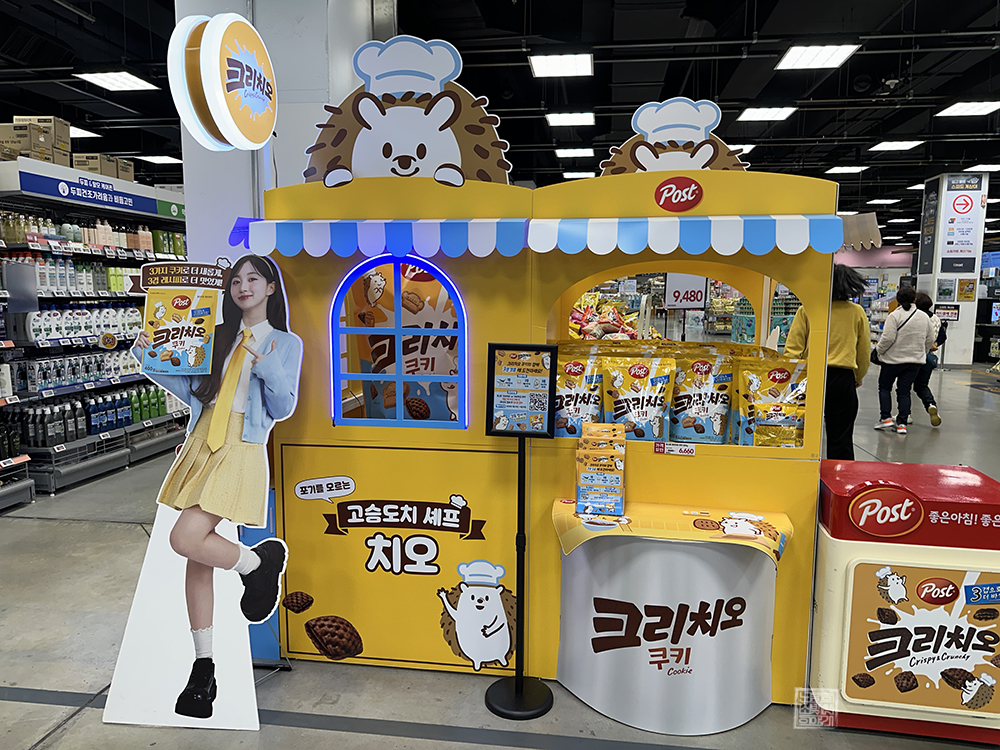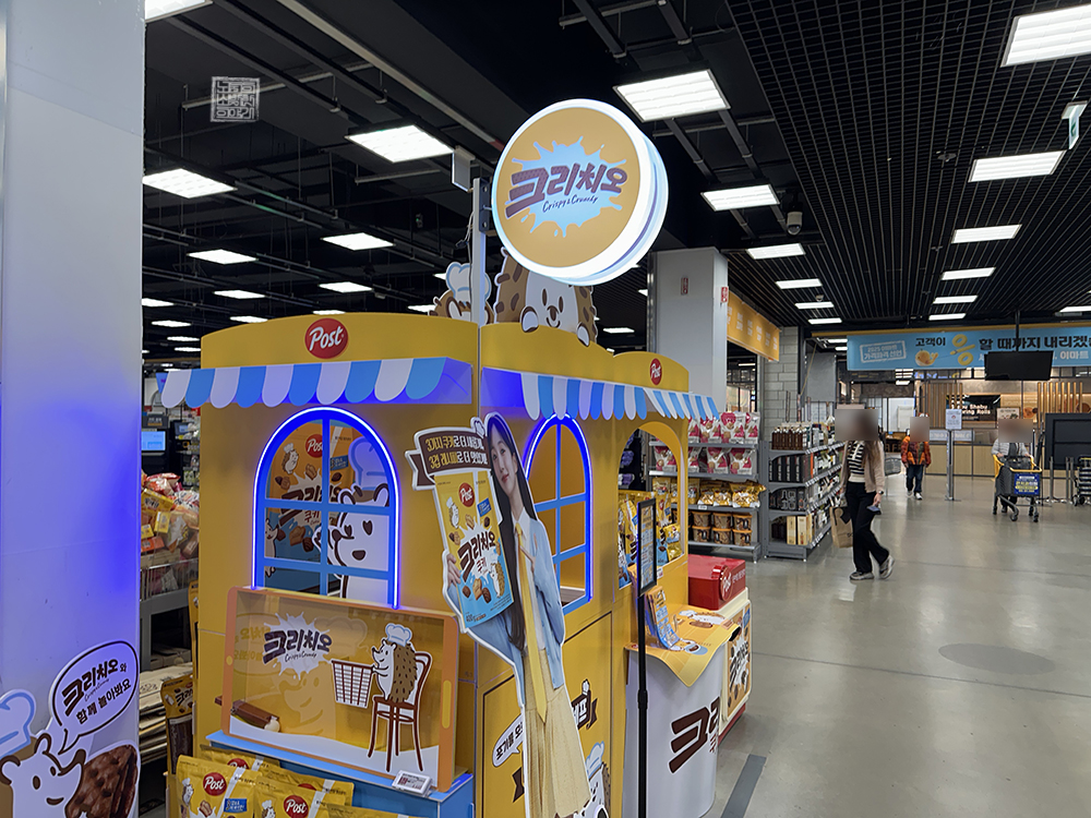 크리치오 쿠키 시리얼 시리즈는 너무나 귀여운 고슴도치 마스코트 캐릭터를 사용하는 시리얼이다 보니 목표 타깃이 분명했다. 바로, 아이들이다. 부모님들이 아이들과 함께 이마트를 찾았을 때 곧바로 마주할 수 있도록 포스트 크리치오 쿠키 팝업 스토어는 카트를 끌고 들어오면 30 걸음 정도 떨어진 곳에 자리 잡고 있었다.