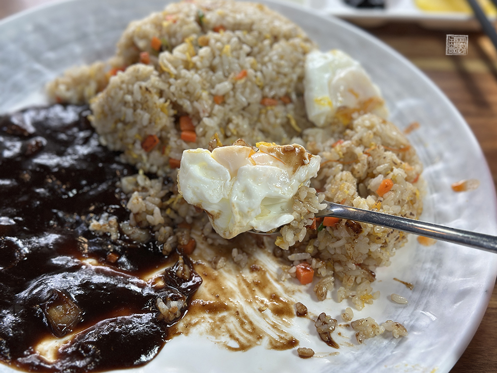 나는 짜장면 같은 면 음식을 먹다 보면 중간부터 젓가락이 무겁게 느껴지면서 젓가락질을 잘할 수가 없었다. 그래서 면 요리는 좋아하지 않는 편이라 볶음밥 곱빼기를 주문했다. 첨부한 사진에서 볼 수 있듯이 볶음밥 두 개를 딱 볶은 듯한 느낌으로 적은 양의 짜장과 함께 계란 프라이를 올려진 채로 받을 수 있었다.
